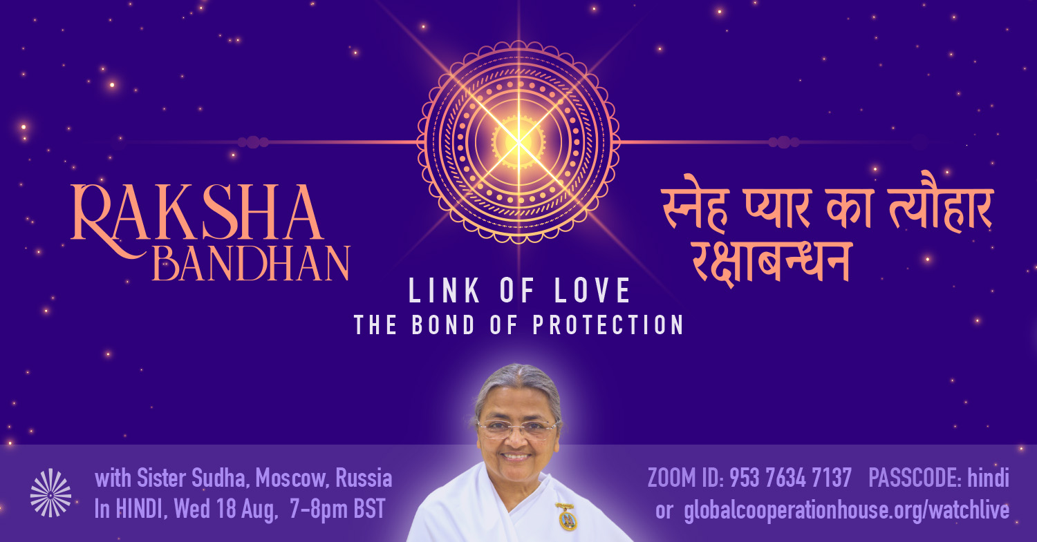 For self-protection, tie the bond of love and purity. At this time it is necessary for all of us to tie this bond with God. And God’s love becomes our connection with all the souls of the world as our brothers and sisters. Remind yourself to always have an elevated attitude and vision for everyone. This will uplift you and inspire others to change as well. Now is the time to remain in God’s loving remembrance. Together, let’s celebrate this Raksha Bandhan by having firm determination to always be light and happy.