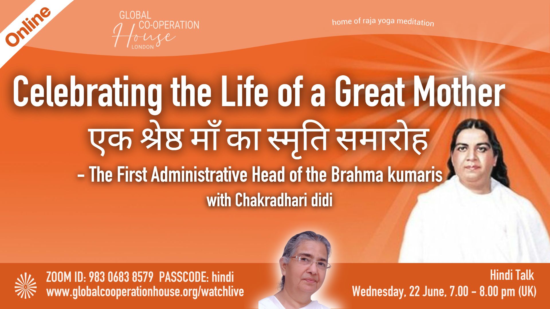 This evening we pay a heartfelt tribute on the 57th Remembrance Day of Mateshwari Jagadamba Saraswati (Mama), the First Administrative Head of the Brahma Kumaris.